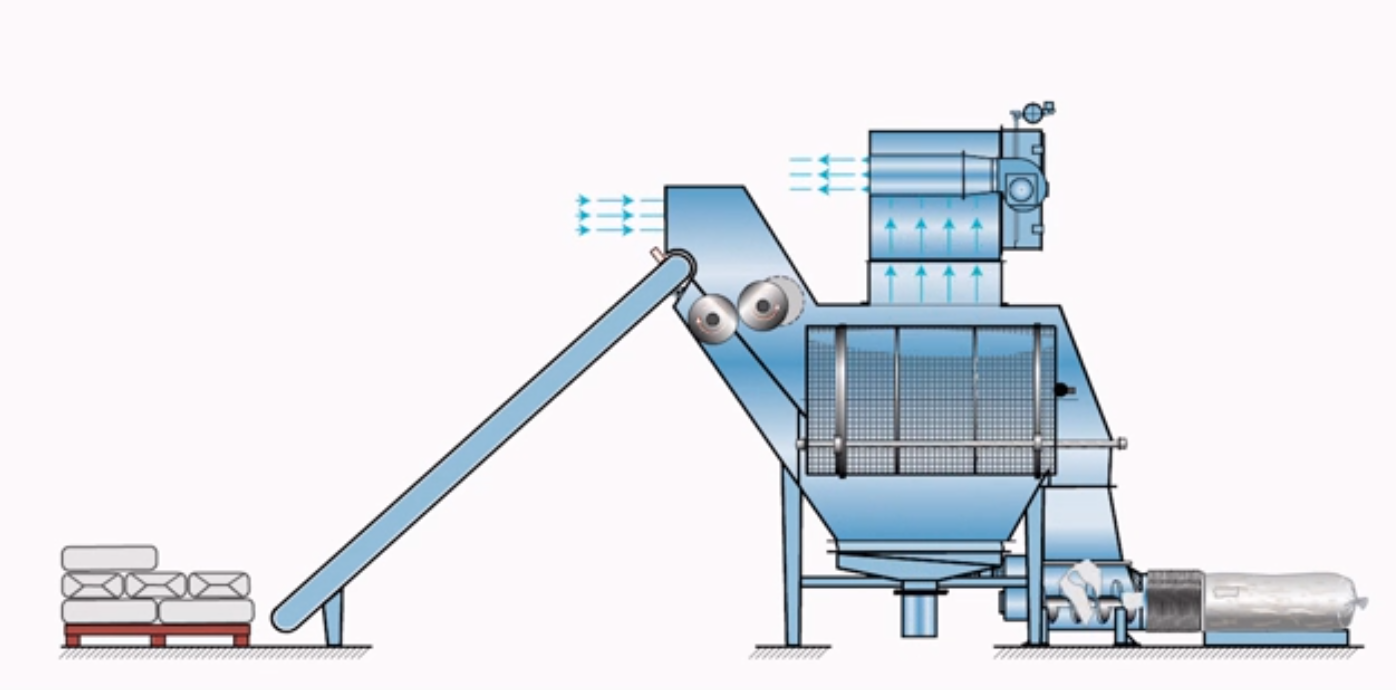 小袋自動拆包機由人工或機器人將包裝袋放到輸送機上,進行輸送到指定位置,或進入破碎機后自動拆包,物料自動分離落入下游設(shè)備。廢袋自動分離后自動壓縮,拆包的過程中產(chǎn)生的揚塵由過濾除塵器凈化過濾達標(biāo)后排出。